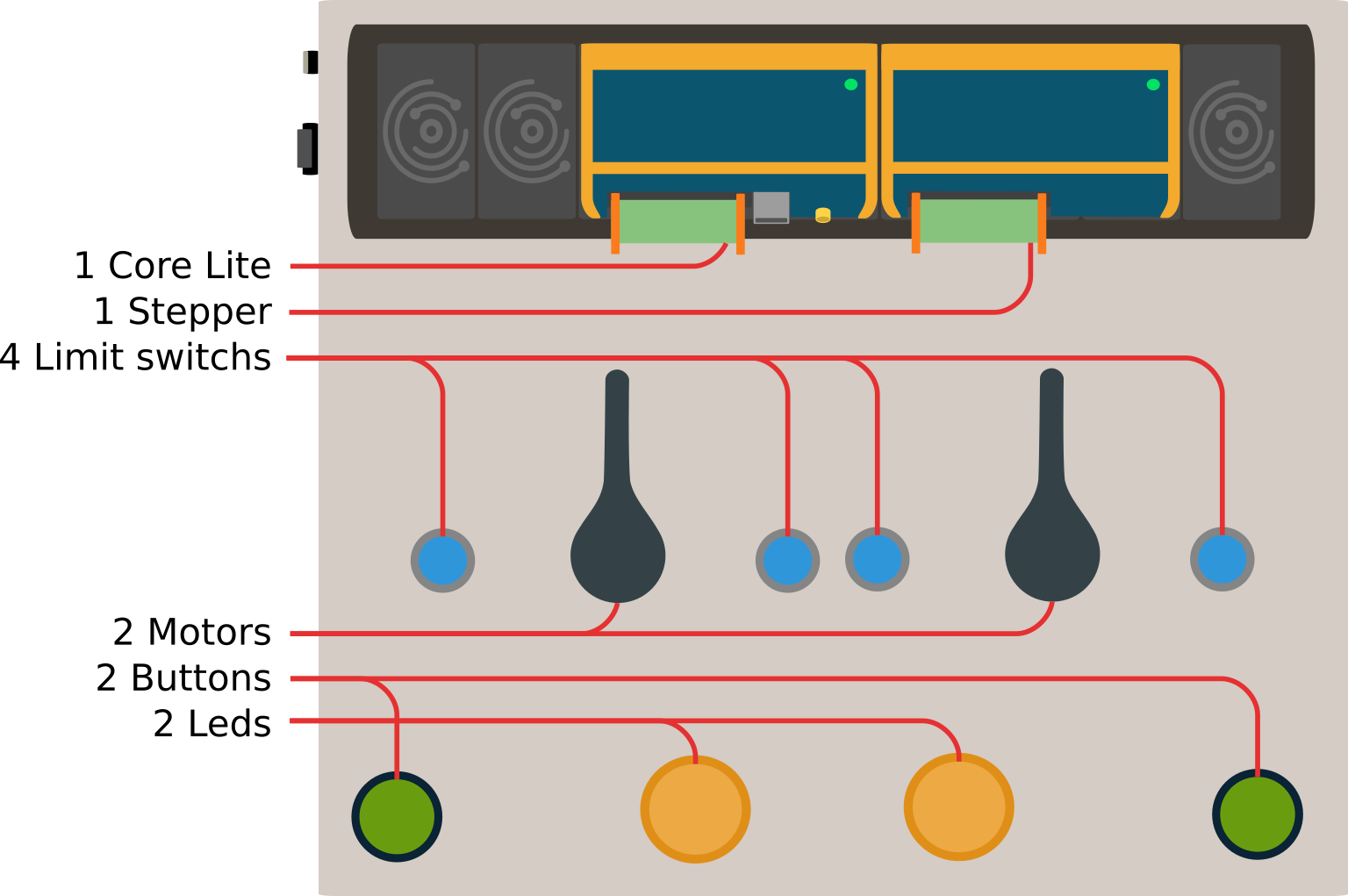 The Demo Motor kit includes two stepper motors, each with a home and end limit switch. It also includes two output LEDs and buttons to test the digital I/O features of the OI-Core master module.
