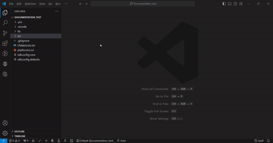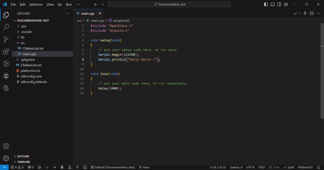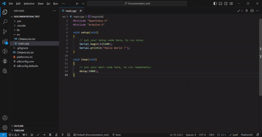 The created project prints ‘Hello World!’ to the serial port. You can find the main code in src/main.cpp. If you are familiar with Arduino, you will recognize the ‘setup’ and ‘loop’ functions.